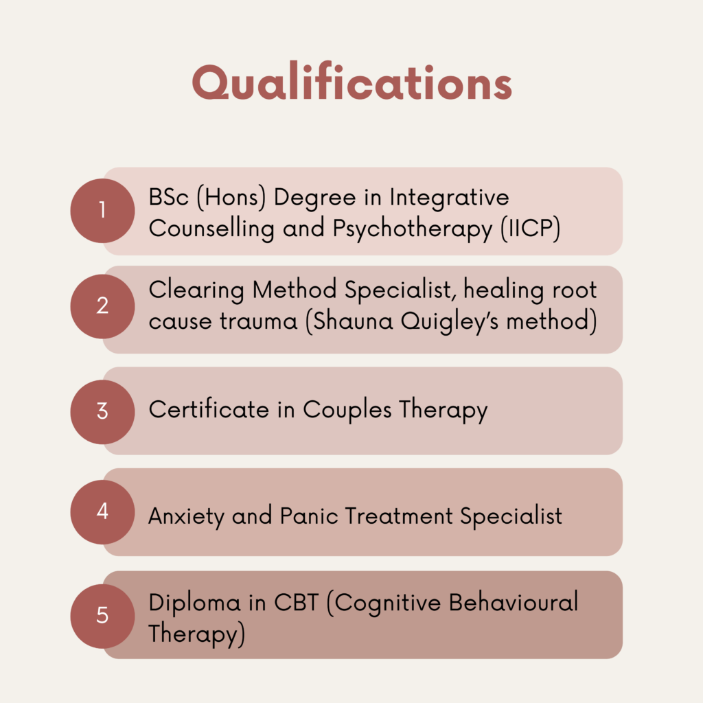 I have completed a four year BSc(Hons) degree in Counselling & Psychotherapy. I am fully insured, and work within IACP guidelines, having pre-accredited status. I have also completed specialist training in the ‘Clearing Method’ – a trauma informed, somatic-led process of healing root-cause pain and wounding from past experiences.